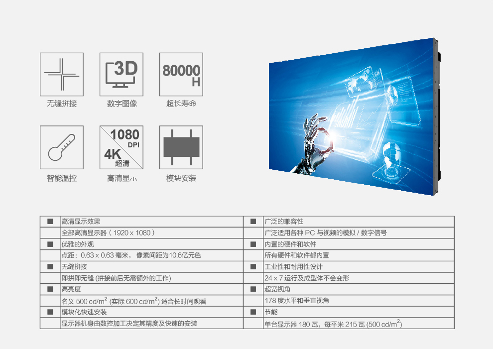 菜單產品中心Product center 液晶廣告機 壁掛式廣告機 落地立式廣告機 電梯超薄廣告機 車載廣告機 高亮廣告機 戶外廣告機 液晶拼接屏 專業(yè)液晶拼接屏 4K液晶拼接屏 廣告拼接屏 無縫液晶拼接屏 觸摸液晶拼接屏 LED顯示屏 觸控一體機 壁掛式觸控一體機 立式觸控一體機 斜面觸控一體機 智能家居觸控一體機 戶外觸控一體機 液晶電子白板 教育電子白板 會議電子白板 工控一體機 觸摸顯示器 紅外觸摸顯示器 電容觸摸顯示器 電阻觸摸顯示器 聲波觸摸顯示器 納米觸摸顯示器 液晶監(jiān)視器 專業(yè)級監(jiān)視器 4K監(jiān)視器 嵌入式監(jiān)視器 機架式監(jiān)視器 開放式監(jiān)視器 SDI監(jiān)視器 高亮監(jiān)視器 廣播級監(jiān)視器 工業(yè)顯示器 4K顯示器 機架式顯示器 開放式顯示器 醫(yī)療顯示器 KVM顯示器 指揮室顯示器 智慧校園產品 專業(yè)定制商顯 多屏廣告機 多功能觸控一體機 多功能廣告機 微信打印廣告機 魔鏡廣告機 透明廣告機 全息廣告機 條形屏廣告機 旋轉廣告機 裸眼3D廣告機 人工智能產品 顯示配套設備 拼接配套設備 廣告機播放盒 OPS播放盒 拼接支架 移動支架 相關軟件 吊頂支架 線材 木架 蜂窩箱 桌面底座 熱門產品 →優(yōu)色3.5mm超窄邊46寸液晶拼接屏→優(yōu)色49寸3.5mm超窄邊液晶拼接屏→優(yōu)色3.5mm超窄邊55寸液晶拼接屏 您的位置:首頁 → 公司產品 → 液晶拼接屏 → 無縫液晶拼接屏 優(yōu)色無縫拼縫液晶拼接屏類別:無縫液晶拼接屏 簡介: 在線咨詢 返回列表 產品說明 相關產品 優(yōu)色無縫拼縫液晶拼接屏 光學補償無縫液晶拼接屏 光學板無縫液晶拼接屏
