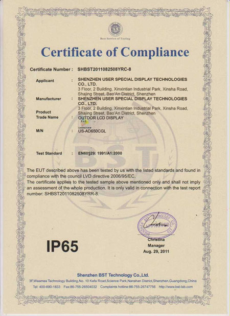 優(yōu)色I(xiàn)P65防水證書(shū)